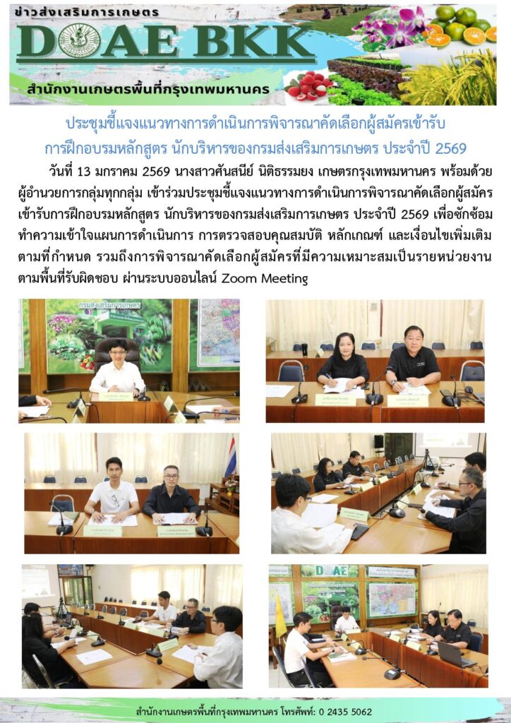 ประชุมชี้แจงแนวทางการดำเนินการพิจารณาคัดเลือกผู้สมัครเข้ารับการฝึกอบรมหลักสูตร นักบริหารของกรมส่งเสริมการเกษตร ประจำปี 2569By admin_doae / 19 มกราคม 2026 Views: 1