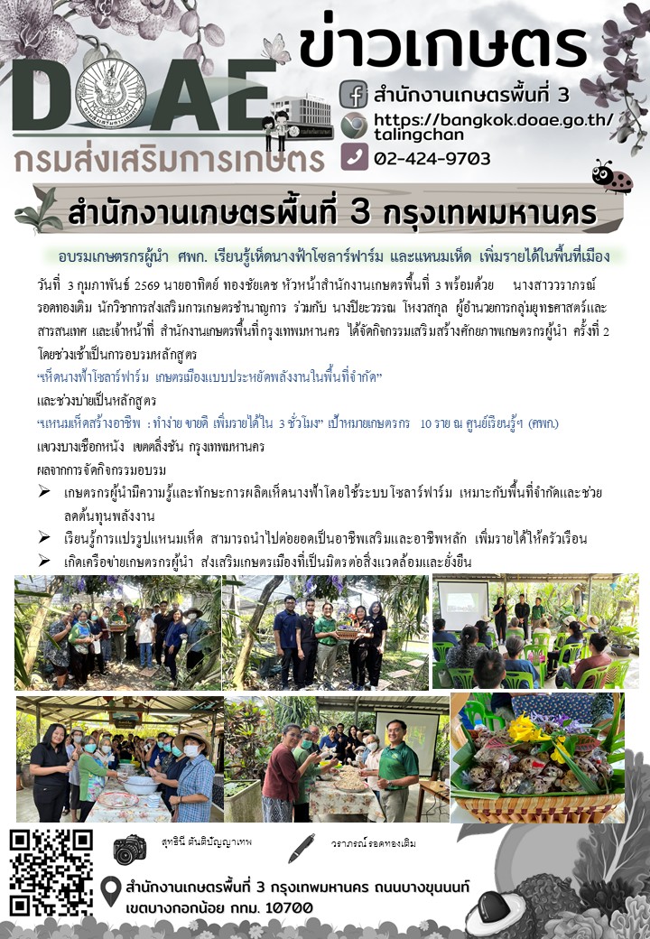 อบรมเกษตรกรผู้นำ ศพก. เรียนรู้เห็ดนางฟ้าโซลาร์ฟาร์ม และแหนมเห็ด เพิ่มรายได้ในพื้นที่เมืองBy bkk3_admin / 3 กุมภาพันธ์ 2026